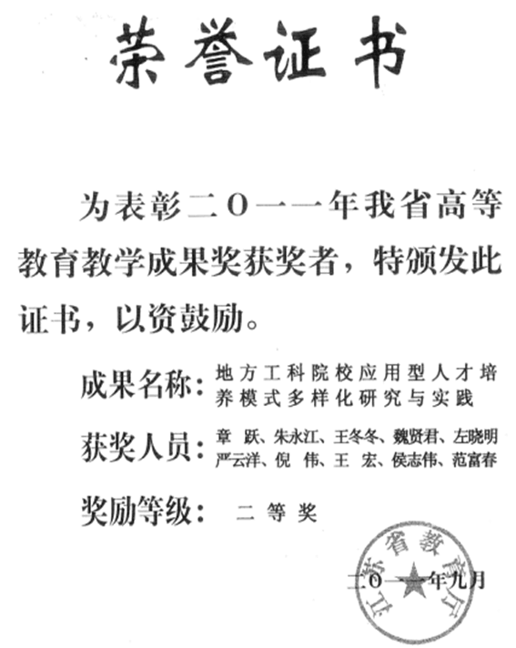 江苏省教学成果奖二等奖,江苏省教育厅,2011年。