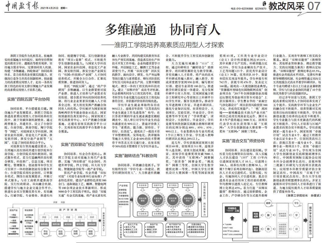 中国教育报发表题为《多维融通 协同育人——淮阴工学院培养高素质应用型人才探索》的报道,2021年4月26日。