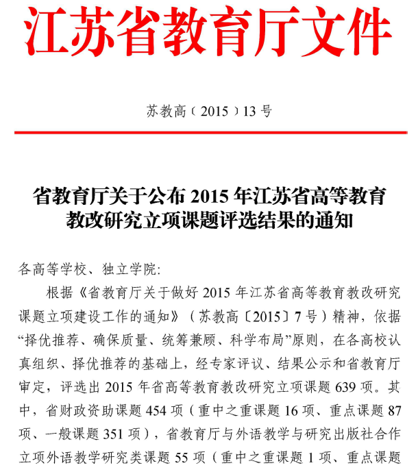 江苏省高等教育教改研究课题,2015年。