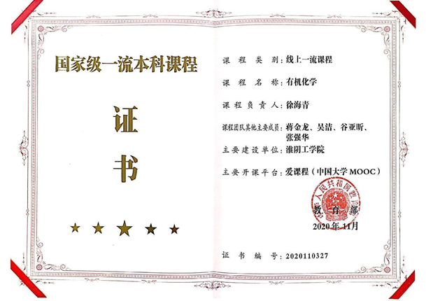 淮阴工学院有机化学课程获批国家级一流本科课程,教育部,2020。