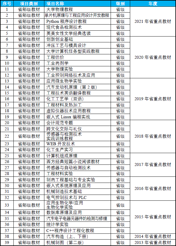 淮阴工学院39部教材获批江苏省重点教材,江苏省教育厅,2013-2021年。