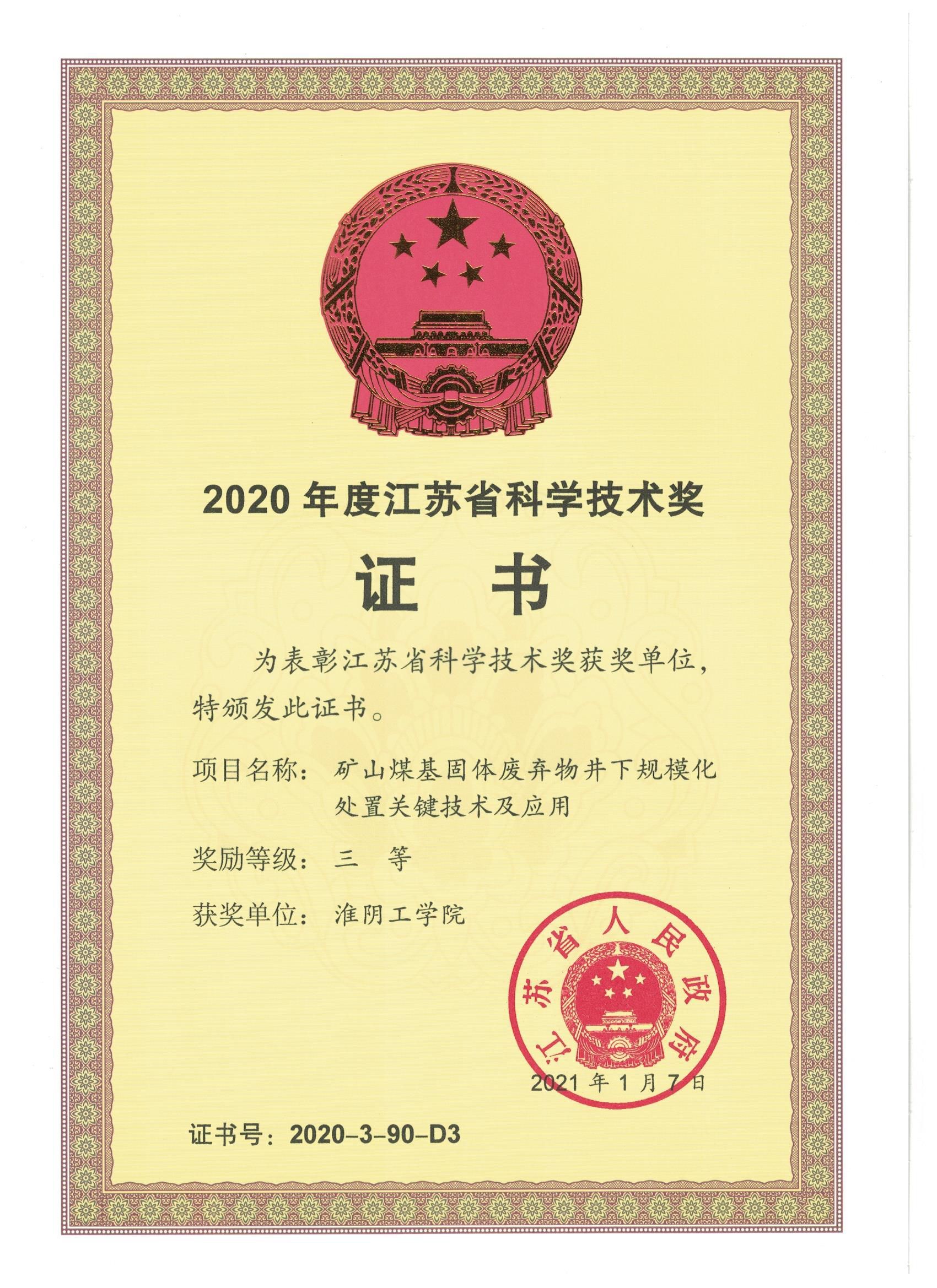 矿山煤基固体废弃物井下规模化处置关键技术及应用 江苏省科学技术奖 江苏省人民政府 2020年