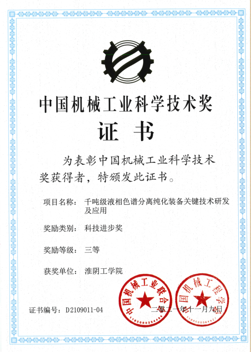 千吨级液相色谱分离纯化装备关键技术研发及应用 中国机械工业科学技术奖 中国机械工程学会 2021年