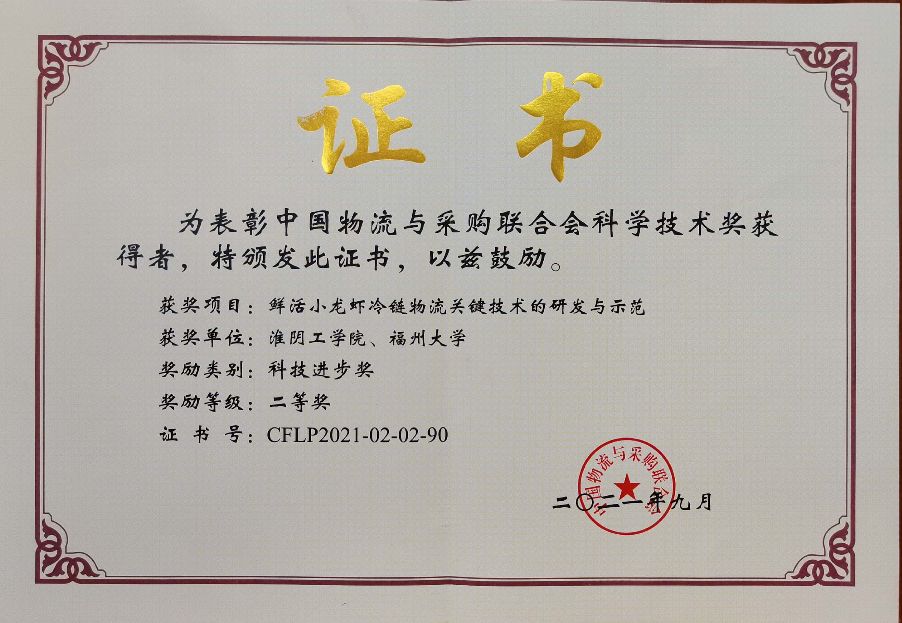 鲜活小龙虾冷链物流关键技术的研发与示范 科学技术奖 中国物流与采购联合会 2021年