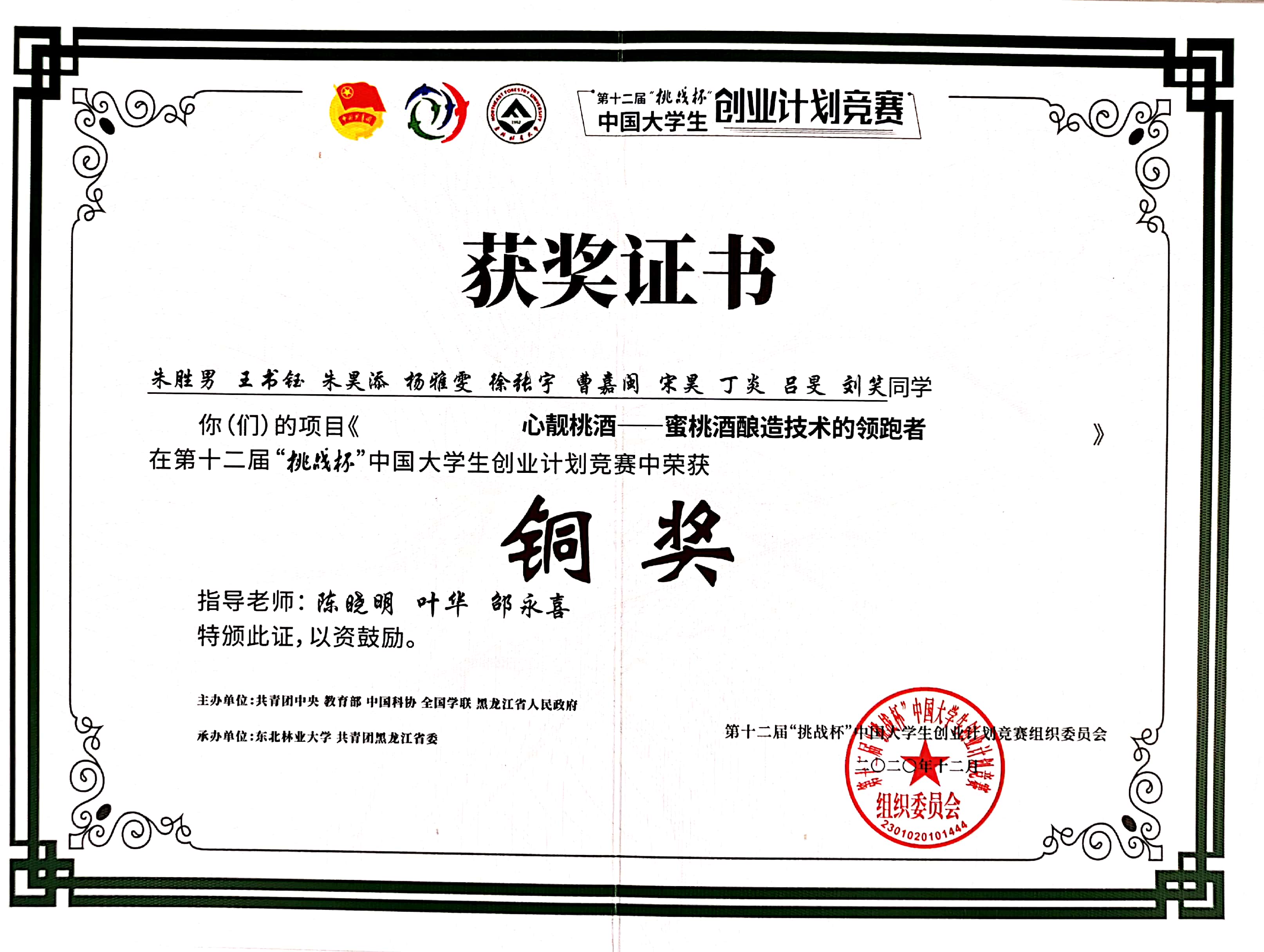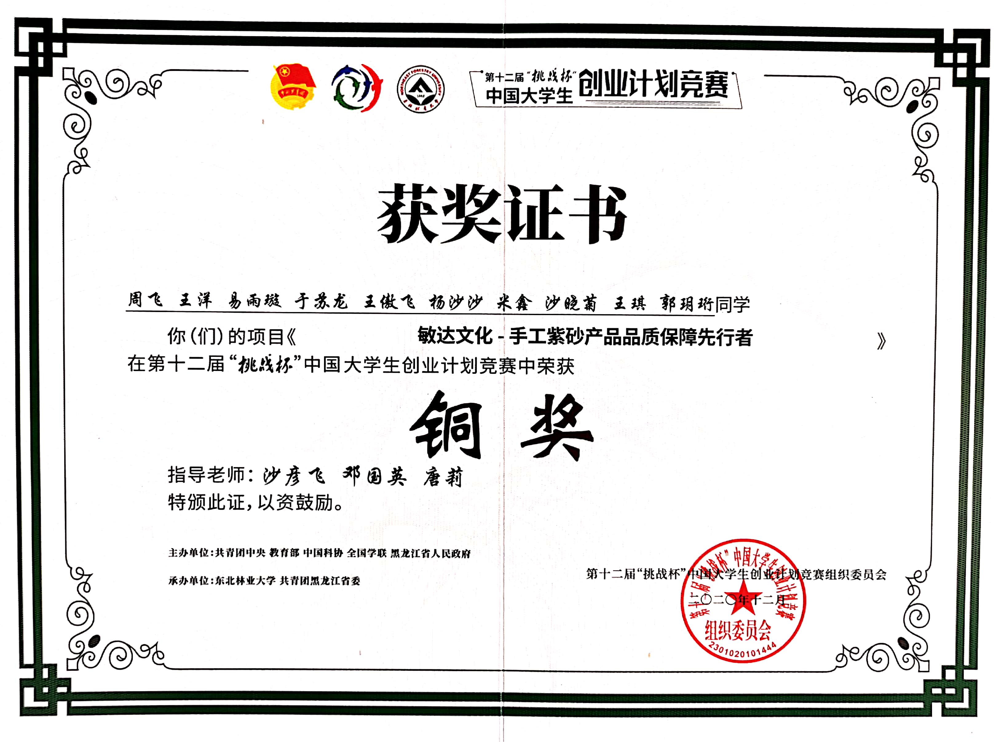 “挑战杯”中国大学生创业计划竞赛国家级铜奖3项,2020。