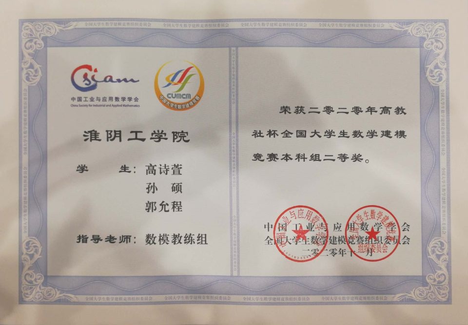 全国大学生数学建模竞赛本科组国家级二等奖1项,2020。