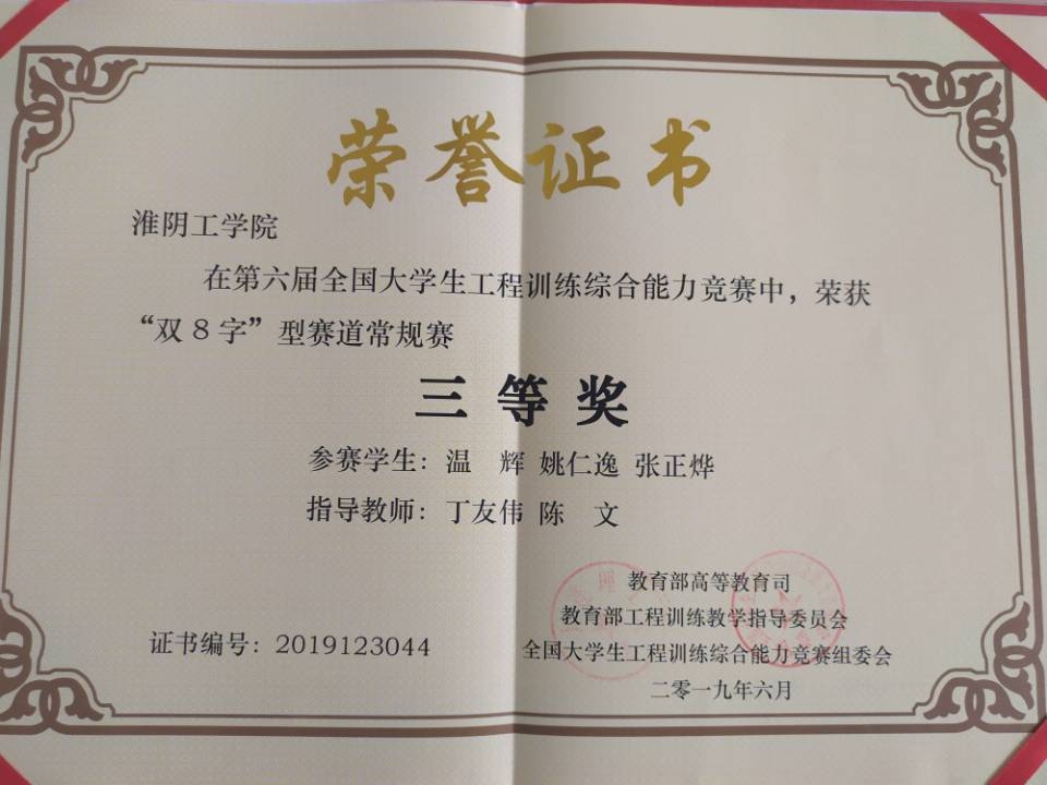 全国大学生工程训练综合能力竞赛国家级三等奖1项,2019