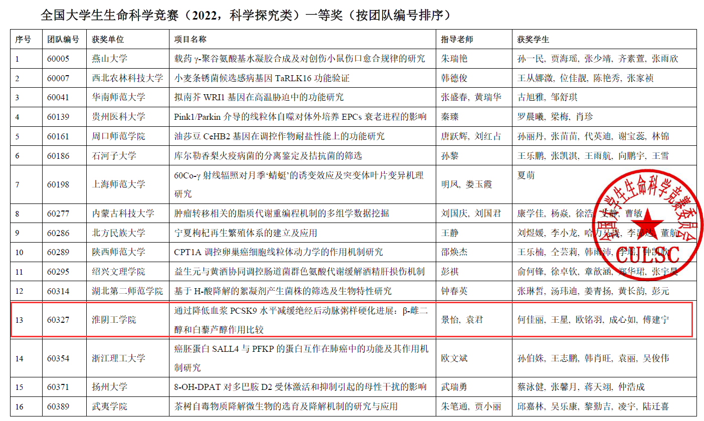 全国大学生生命科学竞赛国家级一等奖6项,2019-2022。