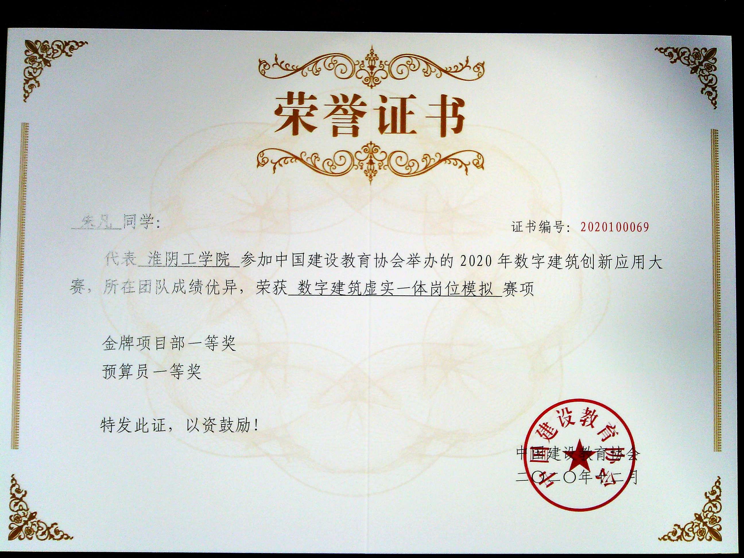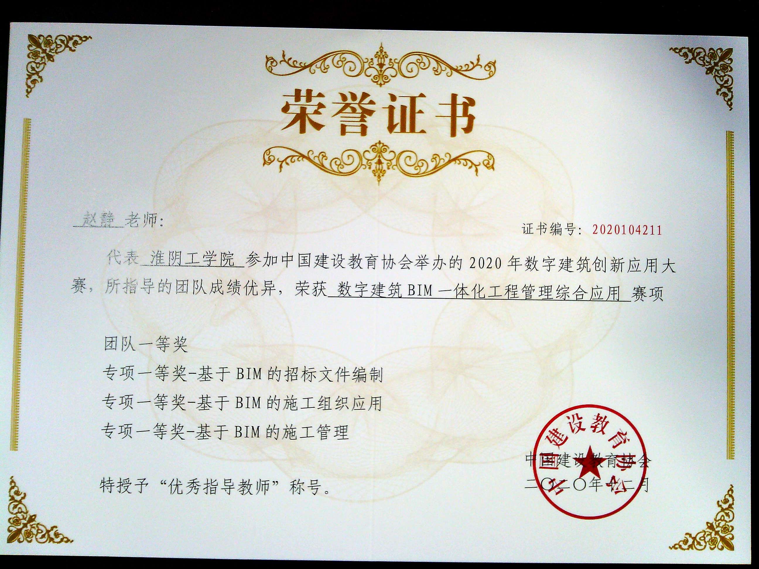 数字建筑创新应用大赛国家级一等奖3项,2019-2020。