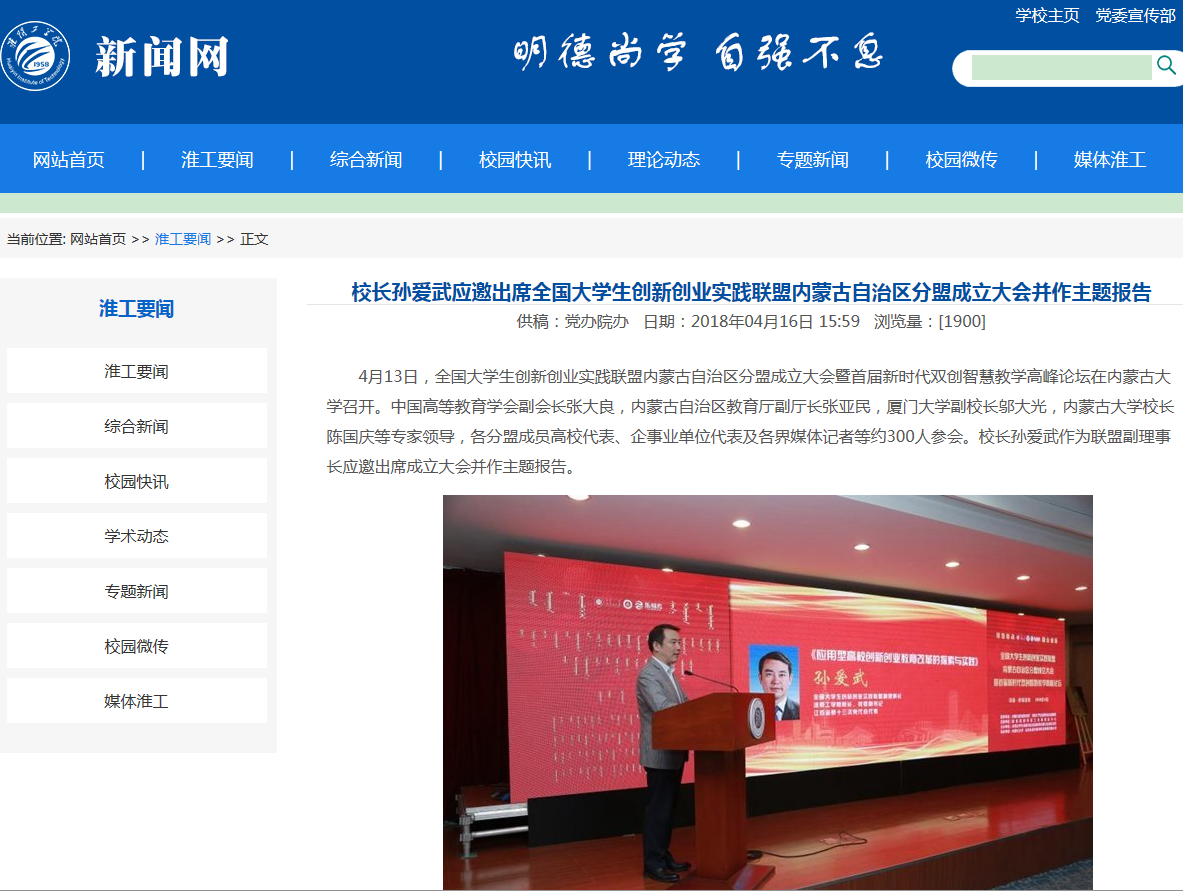 全国大学生创新创业实践联盟内蒙古自治区分盟成立大会,孙爱武以《应用型高校创新创业教育改革的探索与实践》为题作主题报告,2018年4月13日。