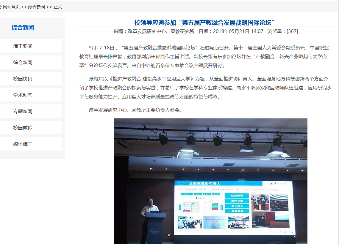 第五届产教融合发展战略国际论坛,张有东以《推进产教融合 建设高水平应用型大学》为题作主题报告,2018年5月17-18日。