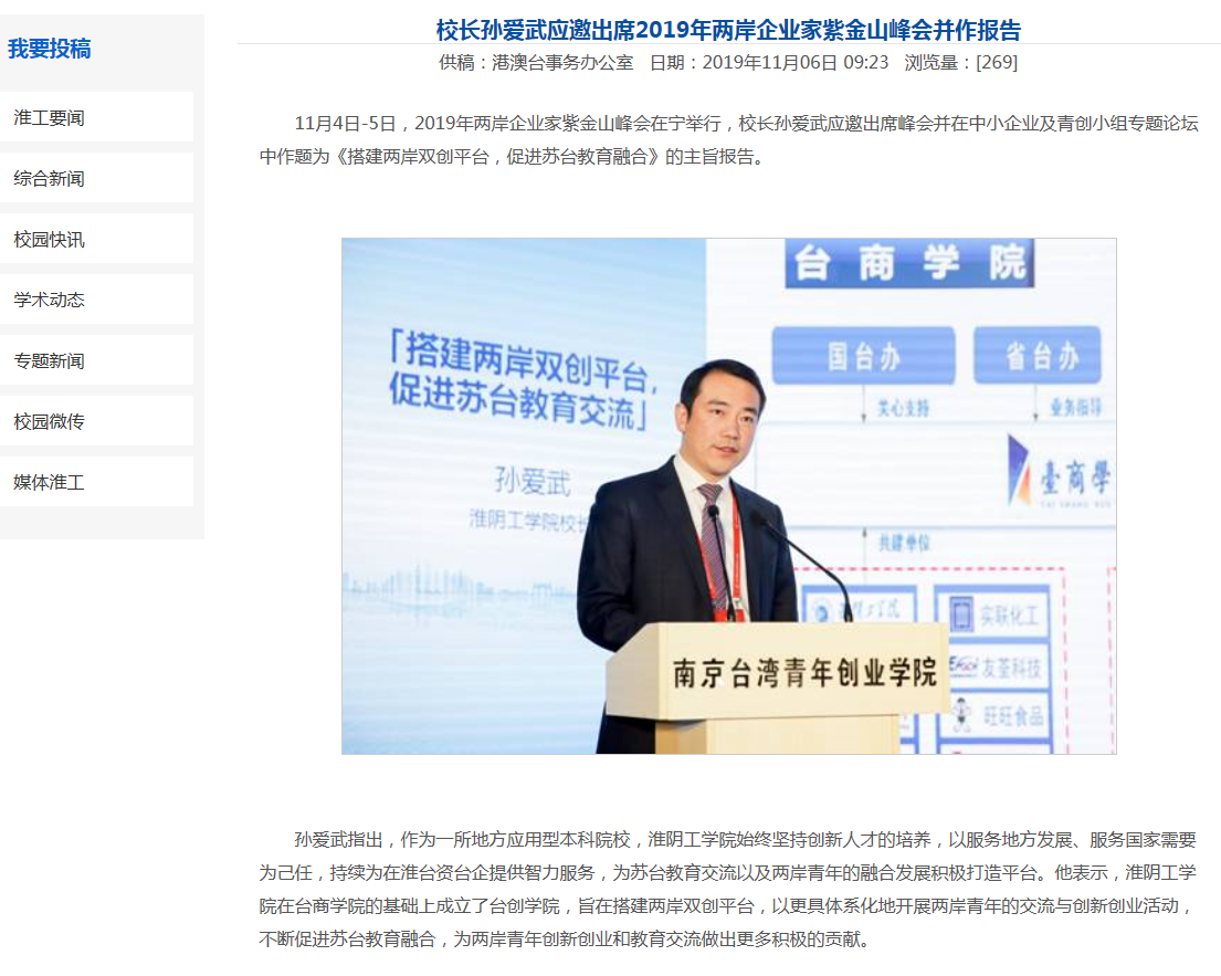 2019年两岸企业家紫金山峰会,孙爱武以《搭建两岸双创平台,促进苏台教育融合》为题作主题报告,2019年11月4日-5日。