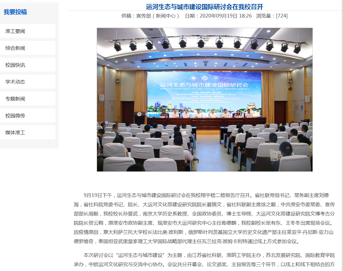 运河生态与城市建设国际研讨会,孙爱武以《扎根淮安办大学 服务地方谋发展》为题作主题报告,2020年9月19日。