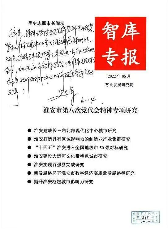 淮安市政府史志军市长批示:《淮安市第八次党代会精神专项研究》,2022。