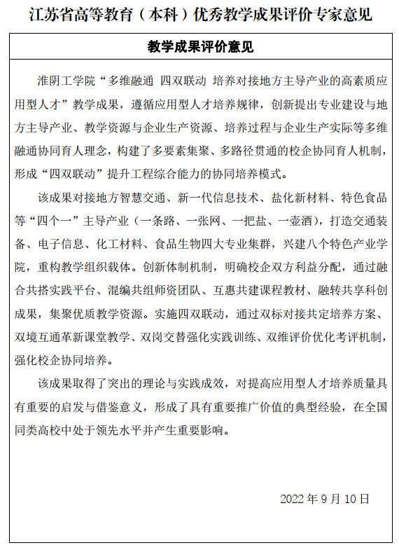 江苏省高等教育学会会长丁晓昌等:江苏省高等教育(本科)优秀教学成果专家鉴定意见,2022年9月10日。