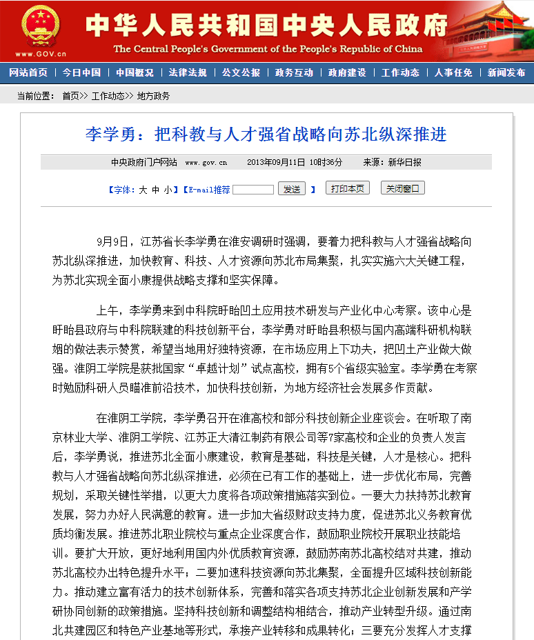 江苏省原省长李学勇:“淮阴工学院为地方经济结构调整和产业转型升级提供了有力支撑”,2013年9月9日。