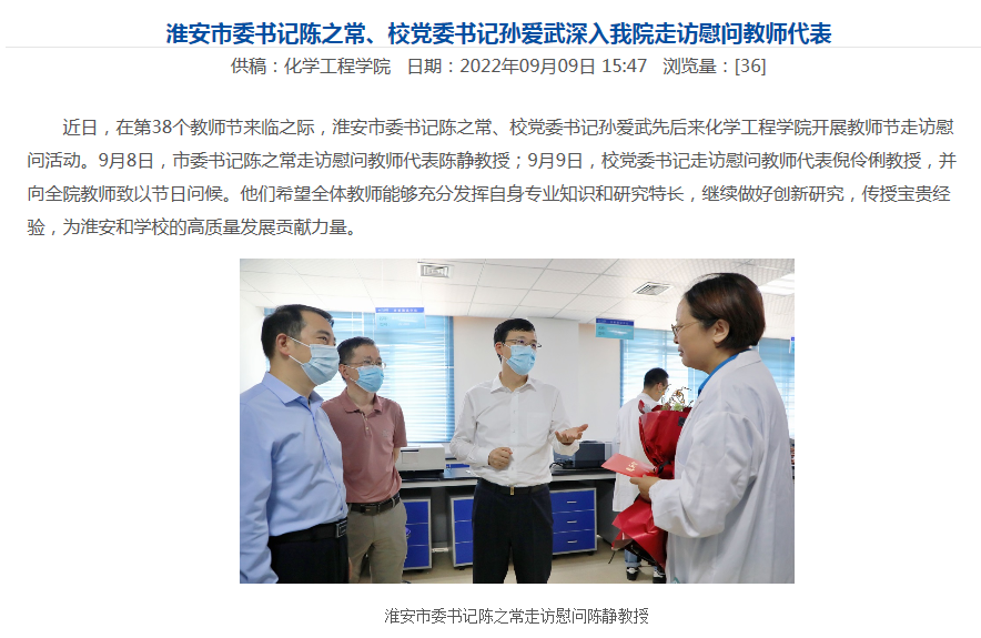 淮安市委书记陈之常:“淮工在推进产教融合方面形成了近产业、重应用的办学特色”,2022年9月8日。